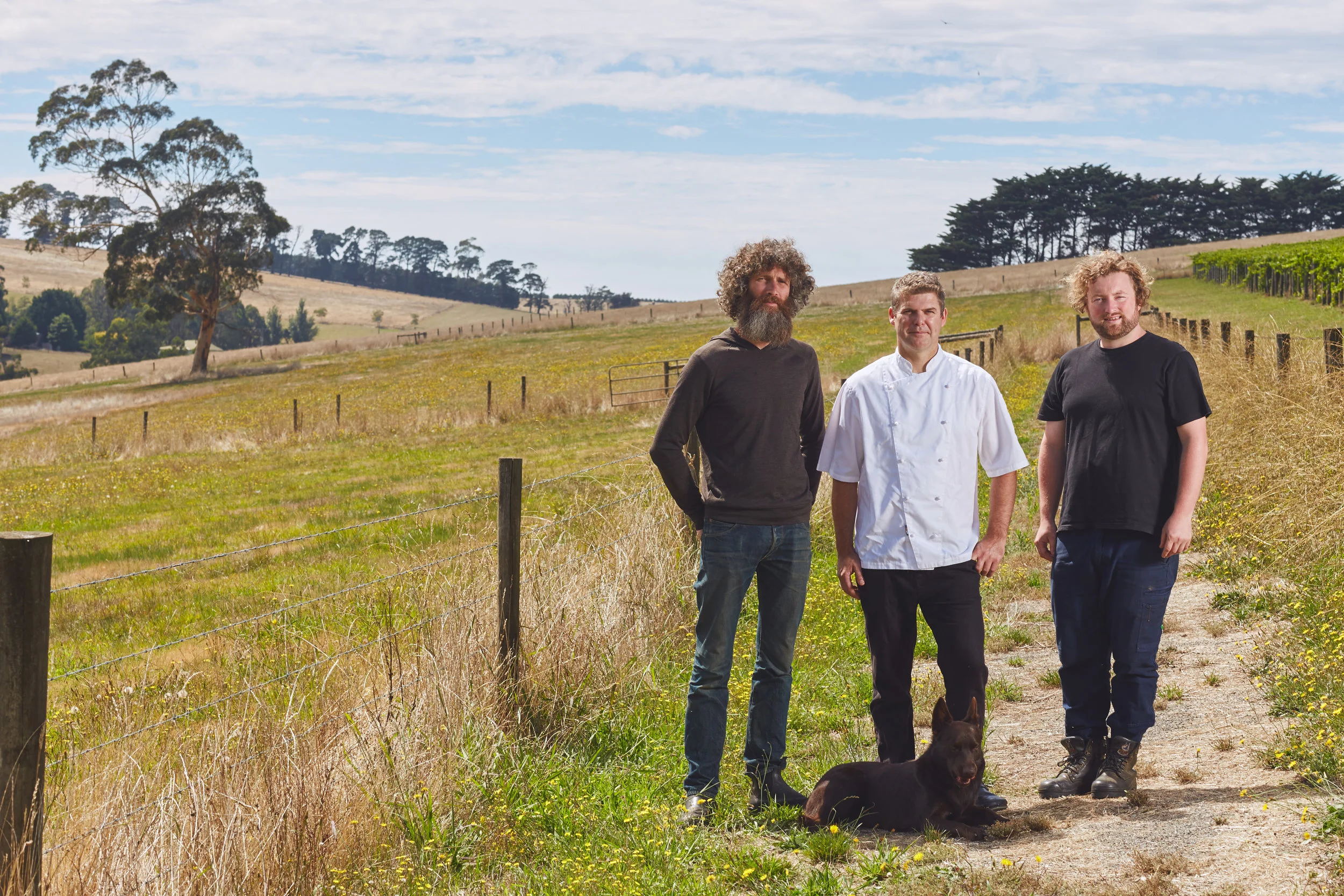 Pictured here (from left) are winemaker William (Bill) Downie, Chef Trevor Perkins and winemaker Pat Sullivan. All well known names on the food and wine scene. These three families have been preparing and sharing long lunches together for the past few years - planning the future of food and wine for the Baw Baw region. A region rich with good soil and a cool climate that supports the growth of high quality produce and a diverse variety of grapes.